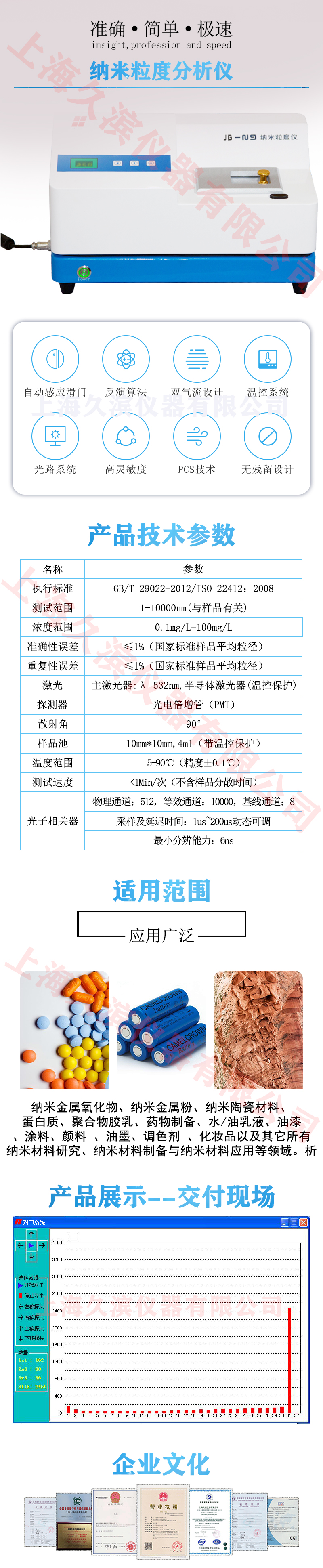 JB-N9是我公司新推出的基于動(dòng)態(tài)光散射原理的納米粒度儀。它采用高速數(shù)字相關(guān)器和專業(yè)的高性能光電倍增管作為核心器件,具有快速、高分辨率、重復(fù)及準(zhǔn)確等特點(diǎn),是納米顆粒粒度測(cè)定的首選產(chǎn)品。