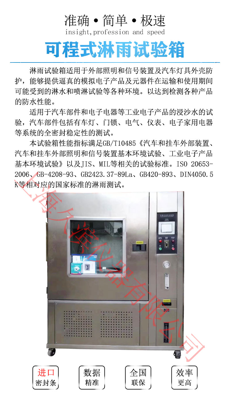 本設(shè)備主要用于考核電工電子產(chǎn)品外殼/密封件在水試驗后或者在試驗期間是否能保證該設(shè)備及元器件良好的工作性能和技術(shù)狀態(tài)。產(chǎn)品技術(shù)引用依據(jù),GB2423.38-90和GB/T4942.2-93;GB4208;GB4706;GB7000中有關(guān)技術(shù)參數(shù)設(shè)計制作的。適用人工淋雨試驗。