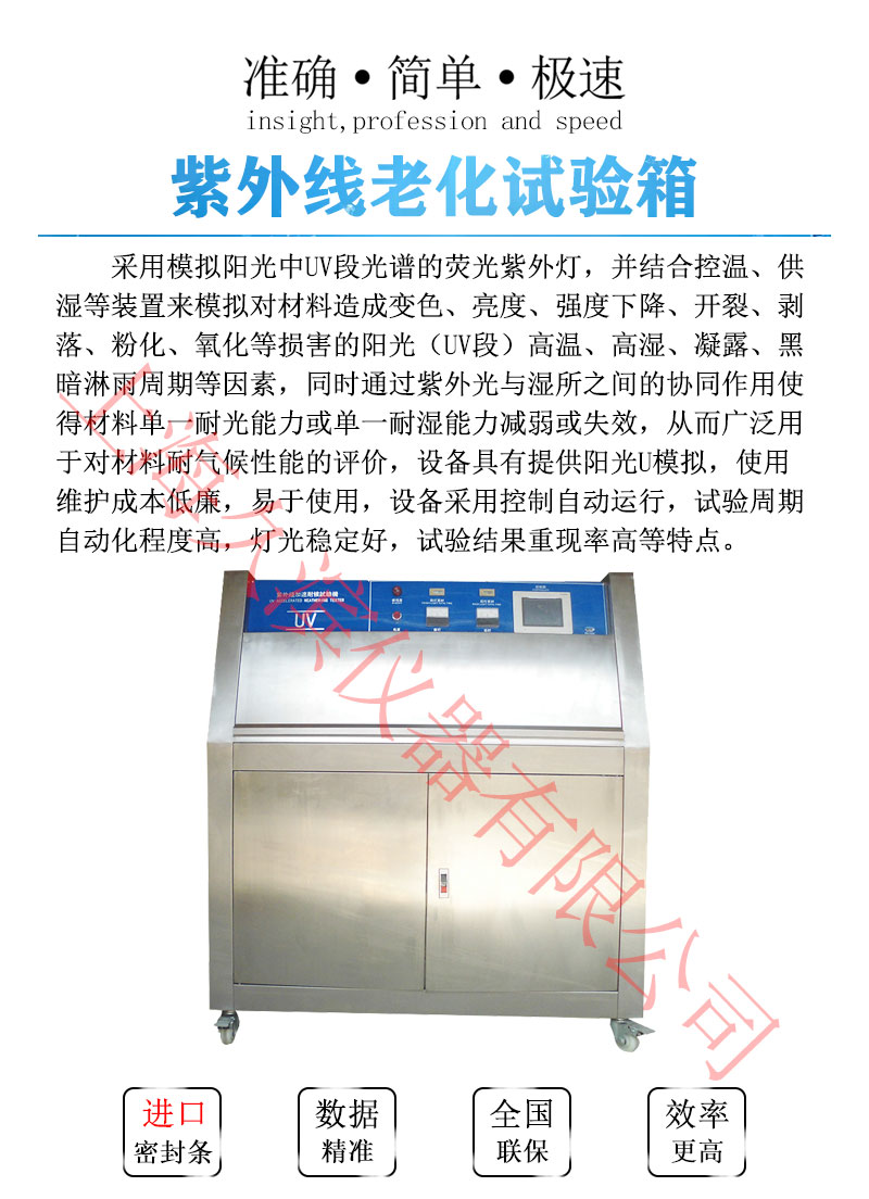 陽光和濕氣對材料的破壞,每年造成數(shù)以萬計的經(jīng)濟損失,紫外光耐氣候試驗箱可以再現(xiàn)陽光、露水所產(chǎn)生的破壞。試驗箱通過將待測材料曝曬放在經(jīng)過控制的陽光和濕氣的交互循環(huán)中,同時提高溫度的方式來進行試驗,試驗箱采用紫外線熒光燈模擬陽光,同時通過冷凝的方式模擬濕氣影響。