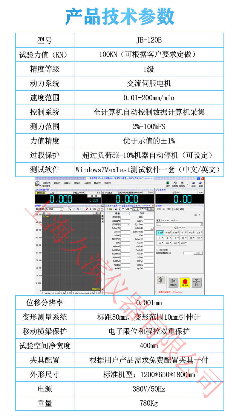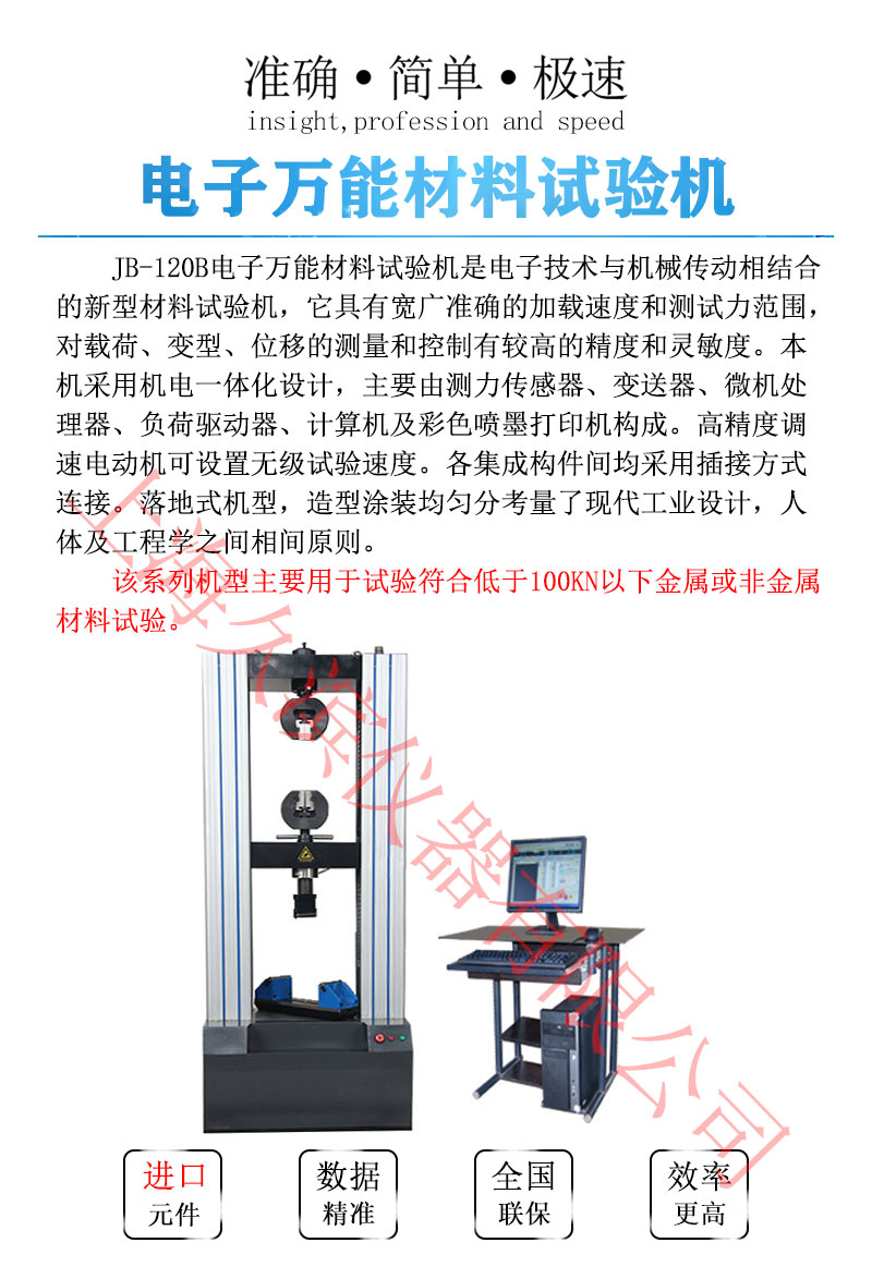 JB-120系列電子萬能材料試驗機是電子技術與機械傳動相結合的新型材料試驗機,它具有寬廣準確的加載速度和測試力范圍,對載荷、變型、位移的測量和控制有較高的精度和靈敏度。本機采用機電一體化設計,主要由測力傳感器、變送器、微機處理器、負荷驅動器、計算機及彩色噴墨打印機構成。高精度調速電動機可設置無級試驗速度。各集成構件間均采用插接方式連接。落地式機型,造型涂裝均勻分考量了現代工業(yè)設計,人體及工程學之間相間原則。