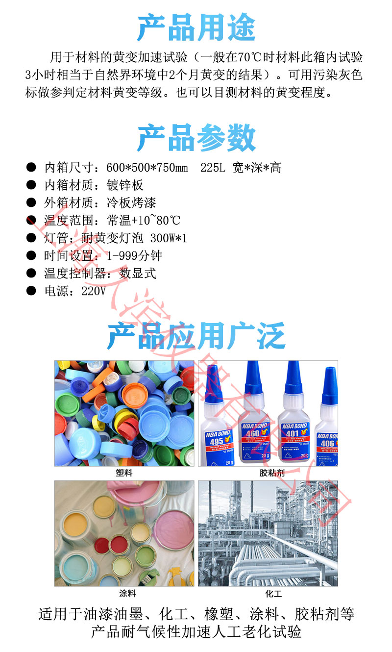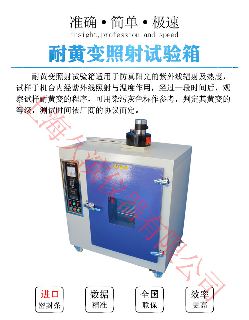耐黃變照射試驗(yàn)箱適用于陽光的紫外線輻照及熱度,試樣于機(jī)臺(tái)內(nèi)經(jīng)紫外線照射與溫度作用,經(jīng)過一段時(shí)間后,觀察試樣變的程度,可用染污灰色標(biāo)作參考。