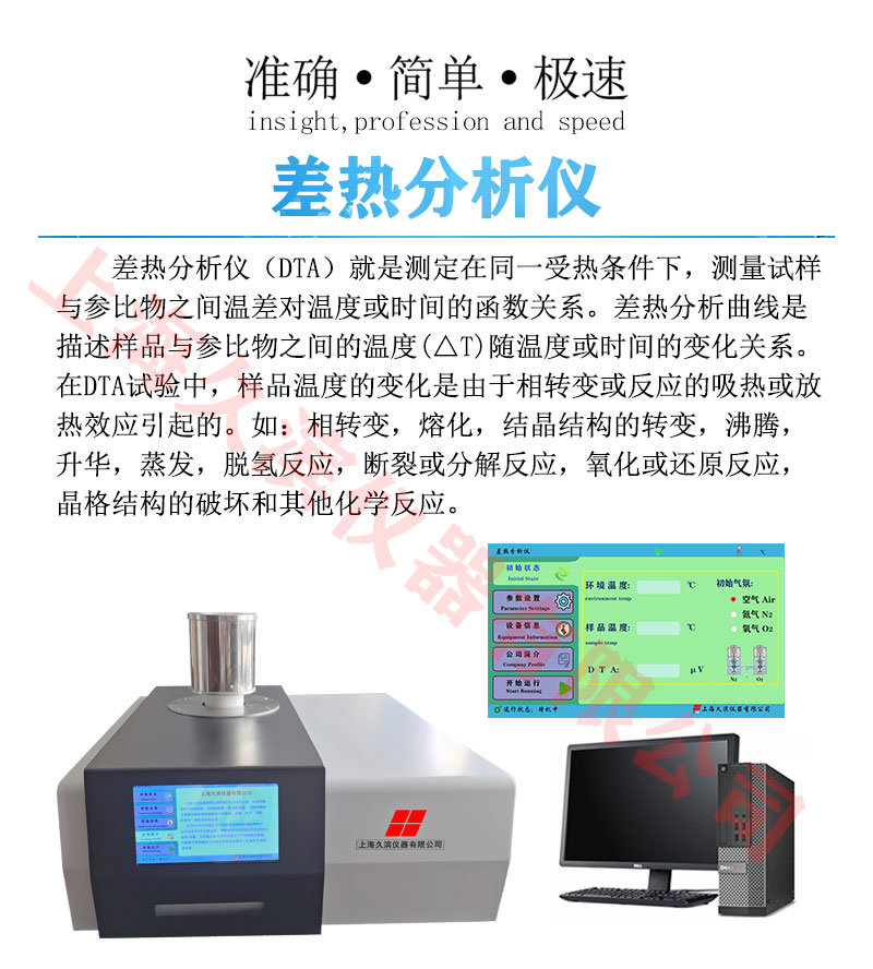 差熱分析是在程序控制溫度下,測(cè)量物質(zhì)與參比物之間的溫度差與溫度關(guān)系的一種技術(shù)。差熱分析曲線是描述樣品與參比物之間的溫度(△T)隨溫度或時(shí)間的變化關(guān)系。在DTA試驗(yàn)中,樣品溫度的變化是由于相轉(zhuǎn)變或反應(yīng)的吸熱或放熱效應(yīng)引起的。如:相轉(zhuǎn)變,熔化,結(jié)晶結(jié)構(gòu)的轉(zhuǎn)變,沸騰,升華,蒸發(fā),脫氫反應(yīng),斷裂或分解反應(yīng),氧化或還原反應(yīng),晶格結(jié)構(gòu)的破壞和其他化學(xué)反應(yīng)。