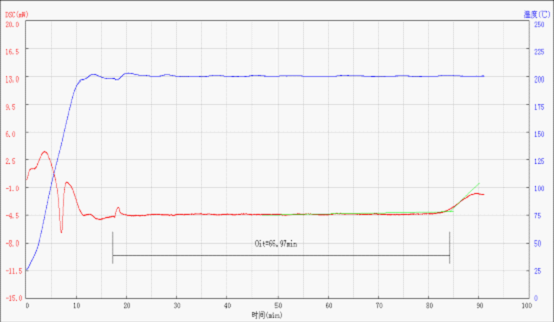 如圖所示即為該聚乙烯(PE)管道的氧化誘導(dǎo)期時(shí)間(OIT),OIT=66.97min。